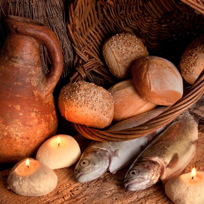 【路加福音九10-17】:「10使徒回來,將所做的事告訴耶穌,耶穌就帶他們暗暗地離開那裏,往一座城去;那城名叫伯賽大。11 但眾人知道了,就跟着他去;耶穌便接待他們,對他們講論神國的道,醫治那些需醫的人。12 日頭快要平西,十二個門徒來對他說:請叫眾人散開,他們好往四面鄉村裏去借宿找吃的,因為我們這裏是野地。13 耶穌說:你們給他們吃吧!門徒說:我們不過有五個餅,兩條魚,若不去為這許多人買食物就不夠。14 那時,人數約有五千。耶穌對門徒說:叫他們一排一排地坐下,每排大約五十個人。15 門徒就如此行,叫眾人都坐下。16 耶穌拿着這五個餅,兩條魚,望着天祝福,擘開,遞給門徒,擺在眾人面前。17 他們就吃,並且都吃飽了;把剩下的零碎收拾起來,裝滿了十二籃子。」