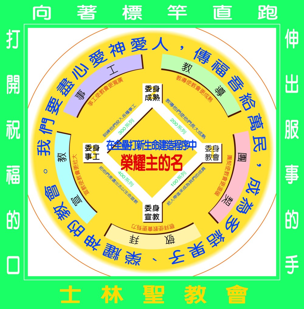 5、宣教-在世界以生命宣教(400):裝備每一位信徒傳福音的技巧,並要用生命的見證傳福音給世人。